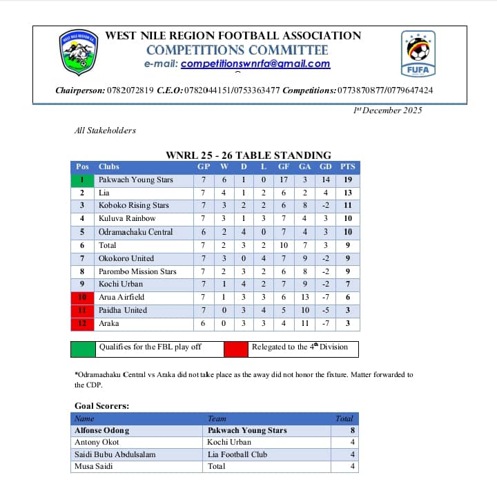 Other matches slated for Match Day 8 in the Westnile Regional League include Total versus Pakwach Young Stars at Swinga Stadium, Parombo Mission Stars against Paidha United at Kings Arena, and Araka facing Okokoro United at Yumbe Booma Grounds on Saturday. Sunday will see Koboko Rising Stars take on Lia Football Club at St Charles Lwanga play grounds, and Kochi Urban challenge Kuluva Rainbow at Yumbe Booma Grounds.